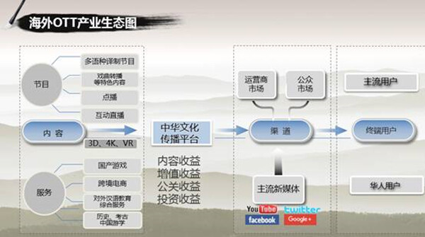 OTT业务是CIBN互联网电视所有业务的基础与核心,海外OTT业务上线运营一年多以来,逐步打通了内容-平台-渠道-终端用户的全产业链,已经形成了一个海外OTT产业生态圈。